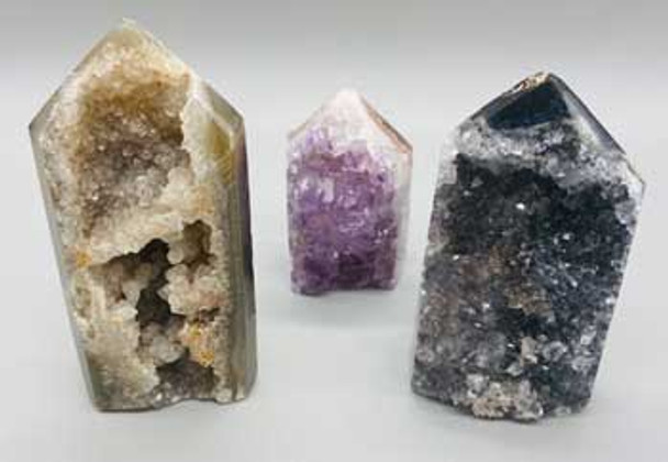 These polished agates comes to a point with an opening in the front, displaying amazing protruding amethyst clusters.The polishing of the agate wraps around the entire piece, giving you an amazing window into nature.Approximate weight only.1.2lbs with each one being unique in size, shape, colors, and inclusions.Sold individually and chosen at random.