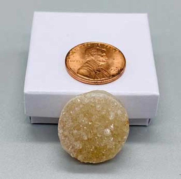 A small disk with great power, amethyst druse cabochon.Cut in the shape of a circle with a flat bottom.Lot's of sparkle and shine coming off these delicate pieces of nature.1" width, with sizes, shapes, colors and inclusions varying from piece to piece.From uruguay