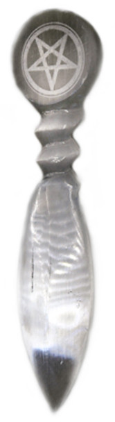 This selenite athames can be used the direct the high vibrational energy through your aura, to cleans, clear and purifying your energy and chakras.Selenite is wonderful to work with and may help with protection, good luck, keeping you calm and may infuse you with some joy! do not get wet as it will breakdown.10" selenite athame with a carved pentagram symbol on handle sizes and shapes may vary slightly and natural lines and inclusions may occur.From morocco.