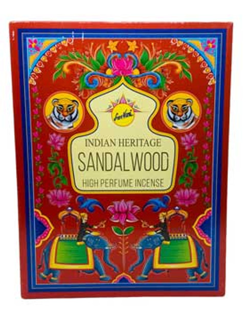 Indian Heritage Sandalwood stick incense. Beautifully packaged box containing approximately 15 premier quality high perfume incense sticks. From India and free from chemicals and toxic agents. 12 individual boxes per case.