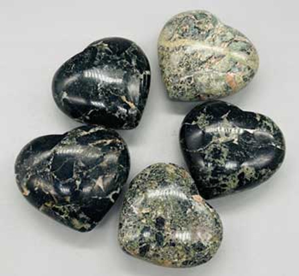 Green stone and black stone are both created in nature from a combination of various rocks.This is a popular stones, used in a variety of items as well as jewelry.The healing properties is similar to the properties of like colored stones.Each one of these is unique by nature and is polished to reveal its wonders.Sizes, shapes, colors and inclusions varying between each piece.Sold individually and from india.