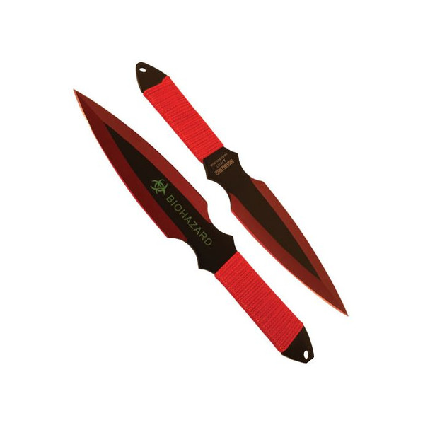 2 Piece Throwing Knife Red Color BioHazard. 9" Length, 2 Piece Set, made from 440 stainless steel, great beginner to intermediate throwing knife. Includes sheath pouch for knives.