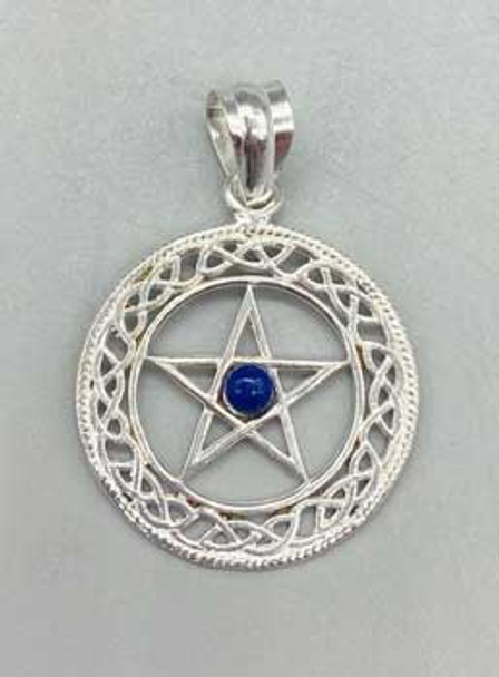 A pentagram sits in the center surrounded by a beautiful celtic knot design.Sterling silver marked.925 with an a lapis stone in middle.Hangs approximately 2 3/4" with a width of 1 1/4".We have matching earrings to go with this pendant as a nice set click here (https://www.Azuregreen.Net/16mm-lapis-pentagram-earrings/productinfo/jeplap/)
