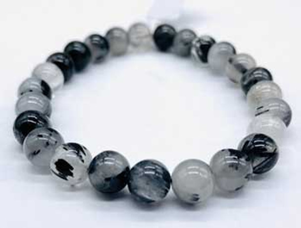 A one size fits most bracelet made from natural stone beads strung on a durable elastic band.Beautiful quartz with black rutile.Beads ranging in sizes from 5-7mm
