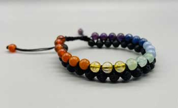 6mm beaded bracelet with a double weave through the chakra stones and lava beads.One stone to represent each charka, amethyst, lapis, blue lace agate, green aventurine, citrine, orange calcite, and carnelian.