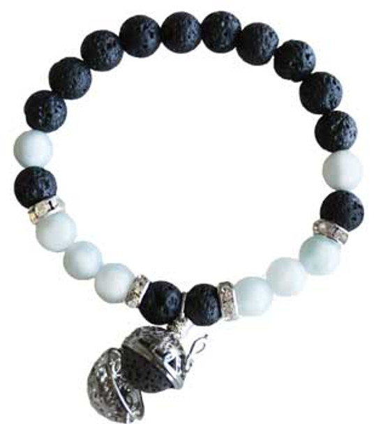 Wear this beaded aquamarine, lava bracelet for in style, for fragrance, or aroma therapy, place one to two drops of your favorite oils, or scents, on the lava ball inside the fragrance locket diffuser, it will last you from 3-5 days, with aroma therapy.The diffuser ball, has secure latch and loop, the aquamarine and lava balls are garnished with 4 sliver toned clear crystal gem banners.