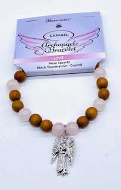 Archangel camael beaded bracelet for love.This bracelet is made with wooden beads, rose quartz beads, quartz crystal and a single black tourmaline bead.Complete with a camael archangel hanging charm.8mm