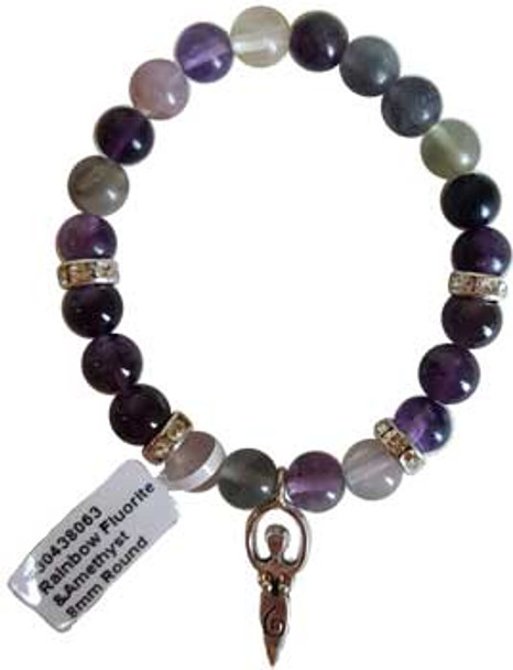 This fluorite and amethyst stone bracelet is unique as fluorite colors vary.It is highlighted with faceted pieces and accented with a pewter goddess.Elastic cord.One size fits most.
