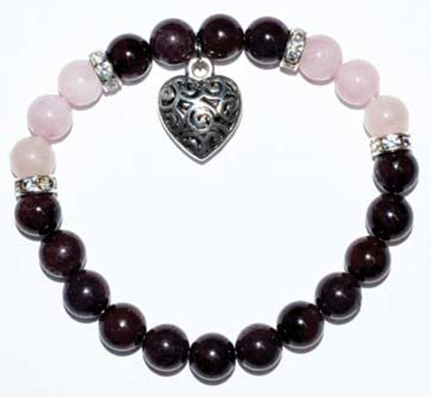 Love will flow in wearing this heart opening bracelet.Garnet is a sensual stone that will bring you luck, while rose quartz will send loving energy through you.8mm beaded bracelet with a heart charm.From china.
