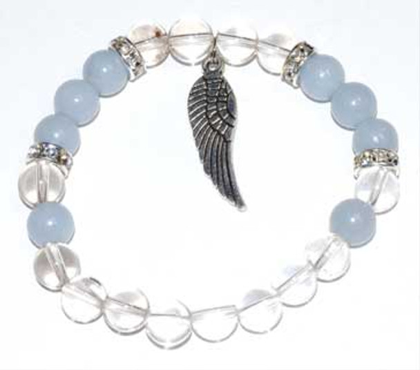 You will feel your angel team around you wearing this soothing piece.With the combination of angelite and quartz offering you peace, ability hear communication, confusion, and will relieve throat and neck issues.8mm beaded bracelet with silver toned angel wing charm and accent pieces.Made in china.