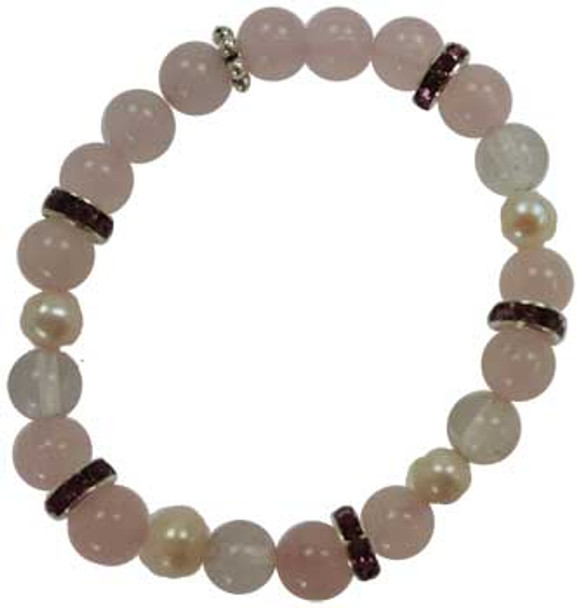 Bracelet of rose and clear quartz beads, faceted spacers, accented with pearl like bead.Many wonderful healing properties in this quartz, including, love, forgiveness, phobias, fears, unconditional love, and guilt.Elastic cord.One size fits most.
