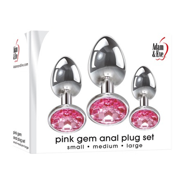 Adorn & stimulate your booty with sleek metal plugs that sparkle! Choose from 3 sizes -- train your way to undeniably hot back door pleasure -- one step at a time! Start with the Small anal plug, add plenty of lube, and experience the tantalizing feel of this special erogenous zone. Once it's all the way in, flash your partner with a pink jewel -- for a flirty look! Use the Medium & Large sizes to work your way up to the most intensely pleasurable anal stimulation you've ever experienced. The smooth metal surface glides in easily, and the flared safety base provides effortless navigation. Metal is a great temperature conductor -- warm or chill plugs to discover new sensations! A black velvet drawstring bag is included for discreet travel & storage. The nonporous surface sanitizes to perfection. Clean with Adam & Eve toy cleaner and a warm water rinse. Set of 3 anal plugsGraduated sizes for easy anal trainingSparkly pink jewel on each basePerfect for intense back door stimulationEnhances orgasms, tooGreat for beginners & advanced playersCan be warmed or chilled for temperature playSmall: 2.76" long, 1.1" wideMedium: 3.15" long, 1.34" wideLarge: 3.54", 1.57" wideMade from shiny, body-safe, polished aluminumStylish jewel made from durable ABS plasticDiscreet black velvet drawstring bag includedWaterproof