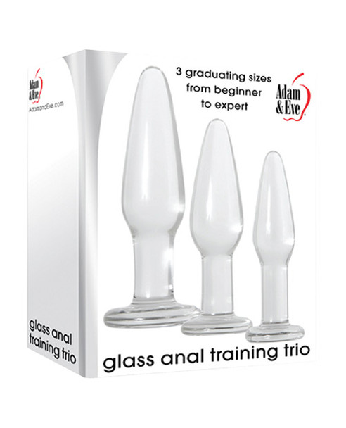 Adam and Eve Glass Anal Training Trio from Evolved Novelties. Perfect for backdoor training and retraining! For those new to anal play or experienced pros graduating glass plugs make it easy! Work pelvic floor muscles for better control, strength and endurance during sex. Start small, move to medium, then take on large with sensual ease! Warm or chill plugs for even more thrills. Non-allergic, non-porous, hygienically superior. Use with any of your favorite lubes, easy to clean. Material: Made from durable, tempered Borosilicate glass. Features: 3 different sized anal plugs. Small butt plug size 4.55 inches by 1.15 inches, medium butt plug size 5 inches by 1.35 inches, large butt plug 5.75 inches by 1.5 inches. 5 year warranty