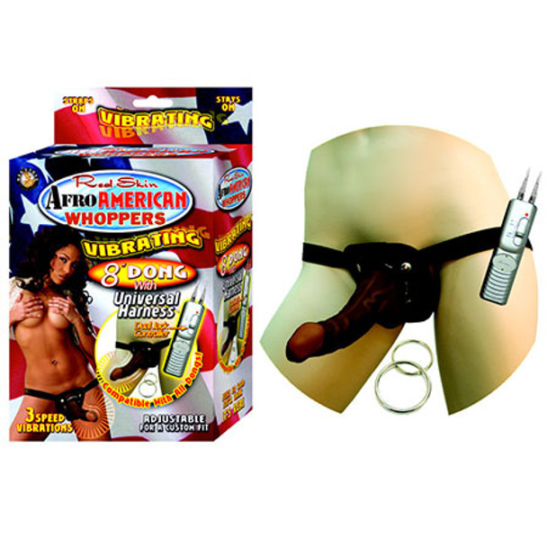 Real Skin Afro American Whopper with Balls 8 in. Dong, part of the All American Whopper line, feels so good you'll think it's real. Features 3 powerful vibration speeds. Requires 3 AA batteries. Harness is compatible with all dongs and has adjustable straps for a custom fit and two ring sizes.