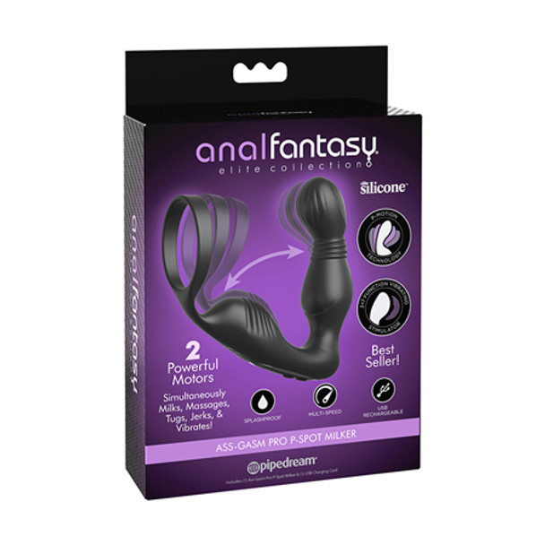 Experience the ultimate in prostate play with the incredible Anal Fantasy® Elite Collection Ass-Gasm Pro P-Spot Milker. This unique prostate pleaser offers true innovation with a fully automated milking system to simultaneously stroke your prostate and rock your perineum. The Ass-Gasm Pro P-Spot Milker's cleverly curved tip offers "come hither" massage movements that allow the base to rock back and forth and apply pressure against the perineum. The P-Spot "Milking Action" rhythmically jerks the C-ring and your cock, delivering rock hard erections and the most explosive ejaculations every time! Your experience is further heightened with a powerful vibrating bullet located at the tip of the P-Spot Milker and features 3+7 thrilling vibration patterns. The ergonomic design with a built-in C-ring gently tugs your package and allows for optional wear for solo sessions or partner play! Multi-Speed2 Powerful MotorsSplashproofUSB RechargeableElite SiliconeDimensions: Product Overall Length (cm) 13.3 Product Weight (Grams) 136 Insertable Length (cm) 10.0 Insertable Diameter (cm) 3.3 C-Ring Diameter: (cm) 4.4 Battery: Charge Time 90 Run Time 60