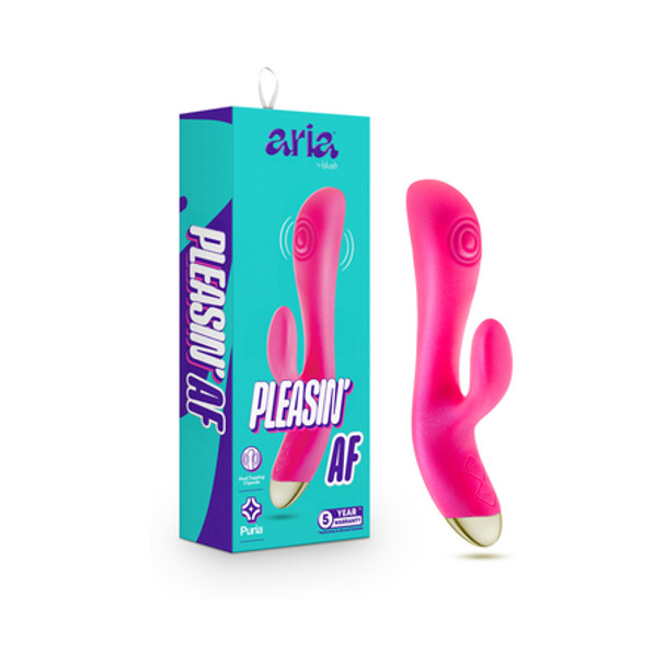 When it comes to luxury vibrators, The Aria® Pleasin' AF silicone rechargeable vibrating rabbit will be your favorite new addition to your collection. It is made from pure platinum cured Puria™ silicone and enveloped in satin smooth UltraSilk that is safe for the body, making it a perfect option for those who prioritize their health and well-being.One of the key features of this toy is the dual pulsing feature on its shaft that sensuously and gently pulsates inside of you. Choose from 3 speeds to flow with you as you ride into orgasm. Your clitoris is bathed in the stimulating vibrations from the soft flexible stem of the clit stimulator. There are 7 vibrating functions to choose from. 3 speed as well as 4 unique vibrating rhythms.The Magna Charge® rechargeable battery ensures that the toy is always ready for use. In addition to its many features, the rabbit is also designed with the user's comfort in mind. Its ergonomic shape and size make it easy to hold and maneuver, while the clit stimulator provide targeted stimulation to the clitoris. Whether used alone or with a partner, this toy is sure to enhance any sexual experience and provide hours of pleasure.Enjoy it in the shower or bath as it is fully IPX7 submersible waterproof. Overall, The Aria® Pleasin' AF is a premium adult toy that is worth investing in. Its high-quality materials, unique features, and user-friendly design make it a must-have for anyone looking to spice up their sex life. Lab tested body safe. Contains no phthalates, paraffins, latex nor fragrances. Measures 8"L x 4.5" Insertable x 1.5"W. Water Based, Hybrid Lube Compatible. Hypoallergenic. Safe for sensitive skin.FeaturesDesigned For G spot & Clitoris PleasureSoft, Flexible 3 Speed Dual Pulsing ShaftClit Stimulator Features 7 Vibration ModesPure Puria™ Silicone. UltraSilk® SmoothIPX7 Waterproof. Magna Charge™ Rechargeable