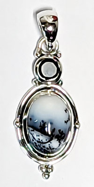 A duo of incredible beauty and energetic offering.Oval dendritic opal with a small black onyx gem adorn the face of this sterling silver pendant.Approximately 1 1/2" long
