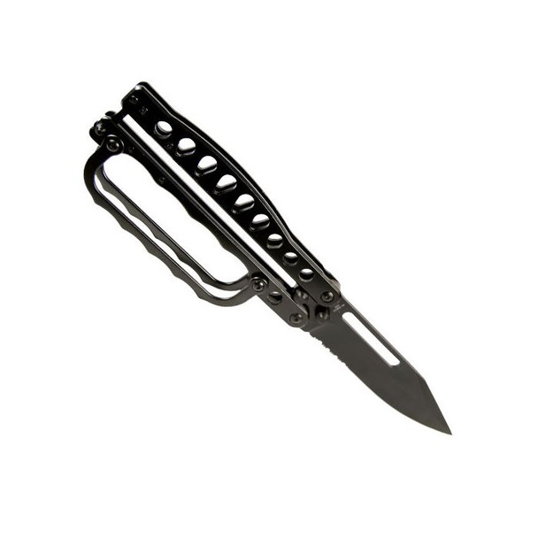 This is a heavy duty well built knuckle butterfly trench knife. It's all metal and super sharp with a serrated blade. The butterfly knuckle knife has a metal knuckle guard screwed onto the handle for easy removal if you don't want it attached. Black Color
