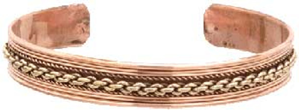 The peaceful symbol of om adorns this two toned copper cuff bracelet.Larger om in the middle of 6 smaller symbols.Attractive powerful bracelet.2 3/4" at the widest point of this cuff style slip on...