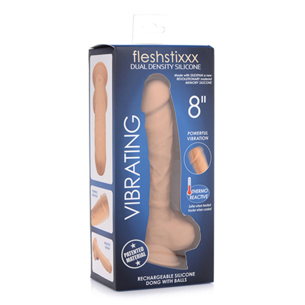 Come meet the total package now with vibration. Fleshstixxx is the first truly bendable, flexible silicone dildo. Made with Silexpan, a thermoreactive new silicone material. Designed to maintain temperature for long periods of time. Simply hold shaft under running warm or cool water to create temperature desired. Crafted with a soft silicone outer sleeve and silicone gel inner core. Sculpted for realism with a variety of sizes and colors. Super-strong suction cup sticks to almost any flat surface. Harness compatible and easy to clean. Extreme FlexibilityDual Silicone MaterialTemperature PlayHypoallergenicNon-PorousAll-Inclusive Sizes and ColorsHarness CompatibleRealistic size and feelMade with USA material.Dimensions Overall Length: 8.3", Insertable Length: 6", Diameter: 1.7"Weight 14.4 ozMaterial Silicone, Silexpan