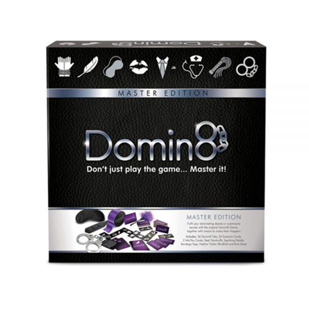 Don't just play the game master the art. Master the art of domination with this devilishly deluxe edition of Domin8! Domin8 is a game of sexy submission and fiendish domination, where each player gets to play out both roles. Relinquish control and let your partner have their wicked way with you or embrace your inner Dom/ Domme and take command! Win the game and your every wish is their command! From Doctor and Patient to Master & Slave, let your imagination run wild with 24 sexy scenarios for you and your partner to role play! Like a domino effect, each naughty act kicks off an unstoppable momentum of kinky delights that will escalate your sexual gratification to a climactic level! Master Edition includes 36 Domin8 Tiles, 24 Scenario Cards, 2 You/Me Cards, Steel Handcuffs, Spanking Paddle, Bondage Tape, Feather Tickler, Blindfold, Rule Booklet.
