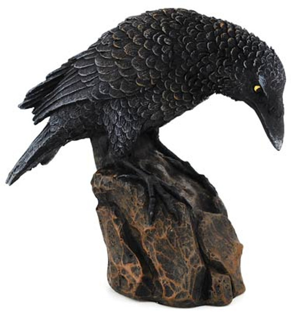 Reminiscent of the poem "the raven" by edgar allen poe, this detailed statue portrays a raven looking down, offering somewhat of a more sinister perspective upon the noble raven.5 1/2" x 6" x 2 1/2"