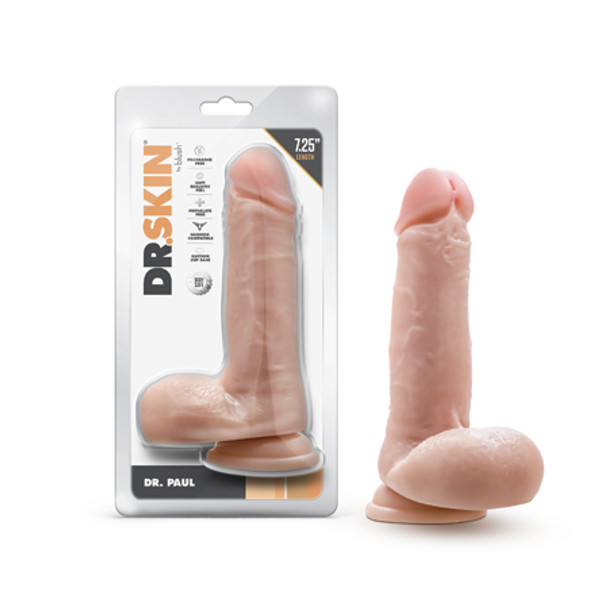 The doctor will see you now! Look out for Dr. Paul! Stick him to any smooth surface with his sturdy suction cup base for a hands-free adventure. Dr. Skin are harness compatible, so strap him into your favorite dildo harness for intense strapon partner play. This dildo has all the sculpted veins, balls, and texture of a real cock and plans to give you that realistic experience you've been looking for. Dr. Paul is formed from soft, Body Safe, Non-Porous PVC. Contains no Fragrance, Phthalate, Paraffins or Latex. Blush excels at creating incredible, realistic dildos that will compliment your fantasies and leave you feeling satisfied! This toy can be easily cleaned with warm water and a fragrance-free soap or your favorite toy cleaner.Remarkably Realistic Feel. Not Too Soft. Not Too Firm. It's Just RightSturdy Suction Cup Base. Strap On CompatibleMeticulously HandcraftedLab Tested & Verified Body Safe. Safe With Silicone, Water Based, and Hybrid Lube7.25"L (5" Insertable) x 1.75" Width