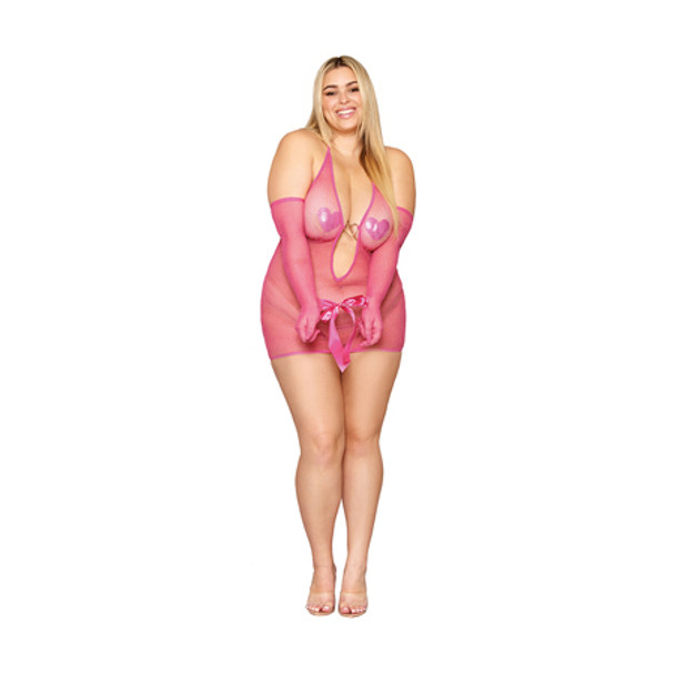 Metallic Fishnet Seamless Chemise and Matching Glove Restraints SetPlunging neckline with gold heart accent and adjustable halter neck tiesOpen back with gold heart accentOpera-length gloves with ribbon wrist restraint tiesThong, pasties, and accessories not includedMeasurements - Queen Size:Size: 16-22Cup: D/DDBust (in): 40-50Waist (in): 36-44Hip (in): 42-52Rise (in): 9-10Weight (lbs): 180-260