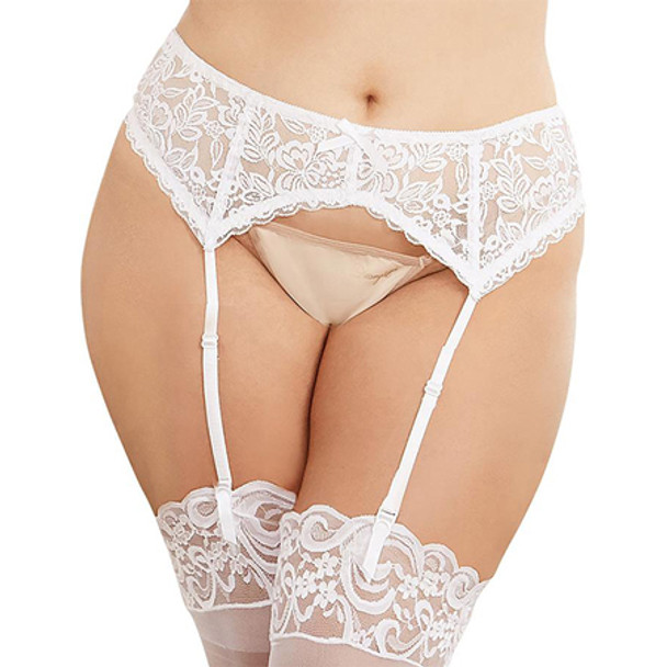Stretch lace garter belt with scalloped hem and hook & eye back closure (thong and thigh-highs not included).Size OSQ: Size 16-22, Cup D/DD, Weight 180-260 lbs., Bust 40-50", Waist 36-44", Hip 42-52"