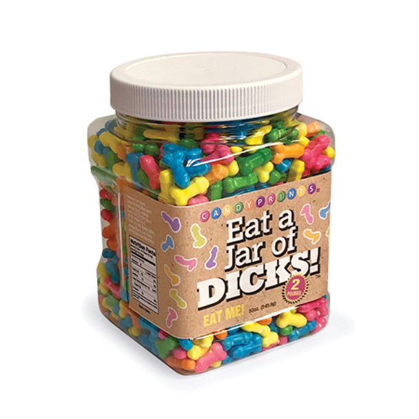 Eat a Jar of Dicks is 2 lbs. of delicious tart dick-shaped candies in a plastic jar. This rainbow of fruit-flavored candy makes a great gift for ex-husbands, bosses, coworkers, family members, and neighbors. Nowadays there are assholes everywhere, so make sure to keep a jar handy in your car, desk, or purse! You never know when you will need it.
