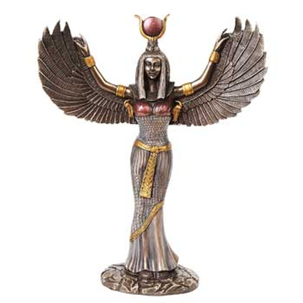 A regal depiction of isis with spread wings.Detailed silvery base with gold and copper red highlights.Hand painted resin 9 3/4" x 3 1/2" x 11 7/8"