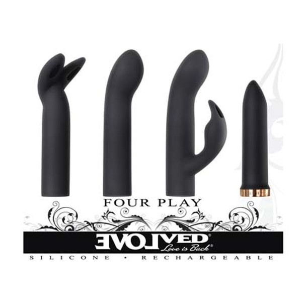 Discover four unique experiences with one versatile toy! Evolved's workhorse durable 7-speed bullet forms the powerful foundation for your choice of G-spot exploration, dual orgasms and bunny ear clitoral pleasure - not to mention classic bullet play all on its own. There are no wrong decisions, only deep satisfaction from the bullet and three different silicone shapes that slip onto it with ease, even underwater since every combination of Four Play is completely water submersible! Clean with Evolved Toy Cleaner and a warm water rinse. 5-YEAR WARRANTY. COLOR: BLACK@np2020-05 @summer2020-10