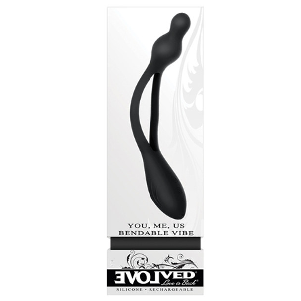 Strike a pose for twice the pleasure and more with this 2-headed bendable toy. An aerodynamic double-bulb pleaser on one end stimulates your back door while the other end is free to nestle against other primary erogenous zones. And here's the best part: A unique posable peek-a-boo shaft connects the two tips for phenomenally creative partner play! Enjoy under water as it's completely submersible. Use plenty of lubricant for anal play and clean with Evolved Toy Cleaner and hot water. Bendable, posable dual-ended vibePeek-a-boo shaft for creative couples play10 vibrating speeds & functions in each endMotors controlled separatelyOne double-bulb tip for anal pleasureOne chunky head for clit or other erogenous zonesPosable flexibility for multiple positionsEasy-to-use 2-button control at thick endLED lights illuminate buttons when in useHeight: 10", Depth: 1.24", Width: 1.51"Made from creamy-smooth siliconeWeight: Under .5 lbWaterproof & submersiblePhthalate & latex freeRechargeable, USB cable included