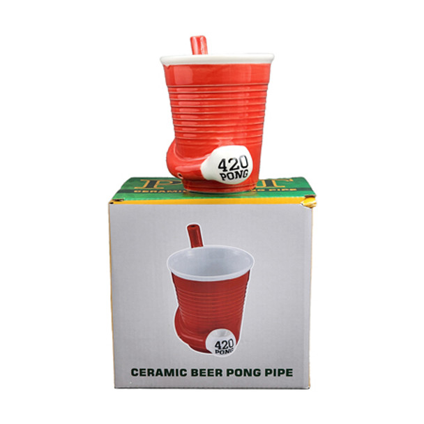 Ramp your Beer Pong game up to a new level with these trendy Beer Pong Pipe Mugs. Your party guests are sure to be stoned after the game!This fun and trendy Beer Pong Mug is made of ceramic in the classic shape of a disposable plastic cup with ridge lines. The mug is bright red with a white inside and the words "420 Pong".Attached to the front of the Beer Pong mug is a pipe where you can pack your tobacco and light it. The smoke filters up the side to the mouthpiece at the rim of the mug. This awesome party game mug and pipe is fully functional and comes packaged in a color gift box. This product is recommended for adult use only.Our new Beer Pong Mug is a must-have for your next stoner party. Your guests will be thrilled to Play Beer Pong with a difference and embrace the 420 lifestyle.Size 5 1/2" W x 3 1/2 D x 5 1/2 HMade of ceramicRed and white mug in the shape of a classic plastic cup with ridge linesWords "420 Pong" on the frontThis product is recommended for adult use only