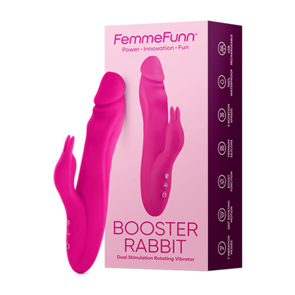 Cordless silicone rabbit vibrator features vortex motion. The clit stimulator vibrates while the G-spot stimulator rotates, creating a unique, new pleasure. The rabbit has dual motors with 3 control buttons that control 3 rotation speeds, 7 vibration modes and a boost button. Includes USB charger. @FEMMEFUN