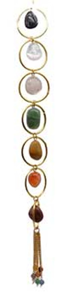 A beautiful hanger displaying a gemstone to represent each chakra.Hanging approximately 15" to the gold tassel.Stones are amethyst, quartz, rose quartz, green aventurine, yellow calcite, carnelian, and red jasper.
