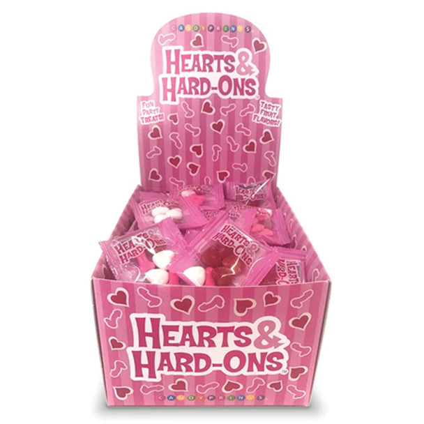 100 Packs in display box. This bag of crunchy and tasty hard candy contains a mix of pink penises and white and red hearts. All three colors have different tasty fruit flavors, and every piece is sure to fill your bachelorette party guest's hearts with love... and dicks!