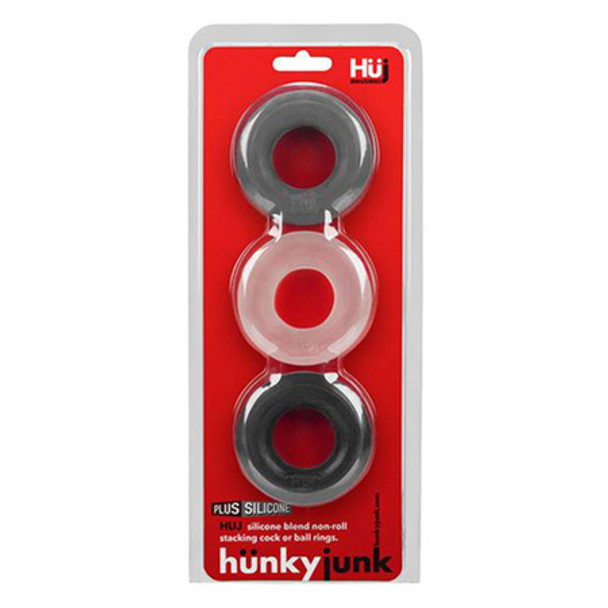 HUJ3 c-ring is our favorite grippy ring you will want to use and use often-just the right size, it's the perfect c-ring or ball-ring that stretches to fit all size guys...it can be layered for a tighter fit, some guy's stack them for gradual ball-stretching, our HUJ3 is a 3-pack of c-rings for more creative play. Hünkyjunk innovates even in this simple design, HUJ3 c-ring has a groove inside the ring that flattens out when worn, this keeps the ring in place and keeps a bit of lube between the ring and you for comfort, HUJ3 c-ring has a flatter inner opening so it wont roll, snag or pinch. Hünkyjunk toys are made of plus+silicone™, a durable blend of TPR for strength & soft silicone for a smooth, warm feel. Wash in warm soapy water-air dry, store separately. HUJ3 c-ring is strong, stretchy and tough, it fits and feels good on--it embodies our motto: Play big, play Hüj...be Hüj. TOY DIMENSIONS: Width: 2" Height: 2" Depth: .75" Outer circumference: 6" Inner Circumference: 3"