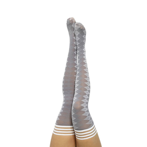 Kix'ies Golf Collection Thigh-High Stockings. Add a little bit of extra flair to your golf outfits with the help of our argyle print, thigh-high stockings! Kix'ies thigh highs are designed for all-day wear, with a no-slip-grip. Available in Petite to Plus Sizes. Kix'ies are the #1 thigh-highs that actually stay up! Size A: Height: 4'11"-5'5" Thigh Circumference: Up to 20" Weight (lbs.): 90-140