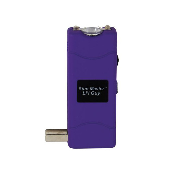 Lil Guy 60,000,000 volts Stun Gun W/flashlight and Nylon Holster Purple. This little stun gun is small and compact with 4.4 milliamps depending on the freshness of the batteries. It has a super bright LED flashlight built in charger and comes with a nylon case. It measures only 3 3/4" x 1 1/2" x 3/4". Don't' let the name Lil Guy fool you. It has a beast inside just waiting to be released. Just press the shock button and the Lil Guy thrashes 60,000,000 volts out of the metal probes. The safety switch is off when in the down position, middle position is the super bright LED flashlight, and in the up position the shock is turned on once the trigger is pressed. Available in 6 colors Black, Pink, Purple, Red, Blue, and Animal Print.