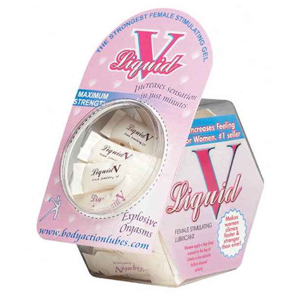 Liquid V Female Stimulant Display Bowl (50 pieces)Liquid V is a maximum strength gel that intensifies sexual pleasure. It starts working on contact and produces a warm tingling sensation to the clitoris. Used by women of all ages, Liquid V is latex compatible and comes highly recommended.