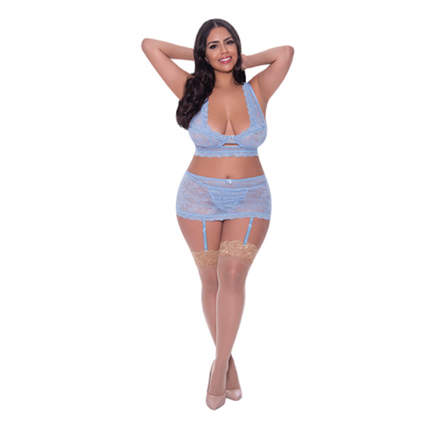 From the Exposed by Magic Silk collection, this style includes: a bralette featuring lace and elastic adjustable straps with sliders, hook & eye closures in the back, a lace skirt with a satin periwinkle bow detail and attached adjustable garter straps with sliders, and a lace G-string.A staple favorite with periwinkle lace that is soft and designs that are oh so flirty.Materials: 90% Nylon, 10% Spandex