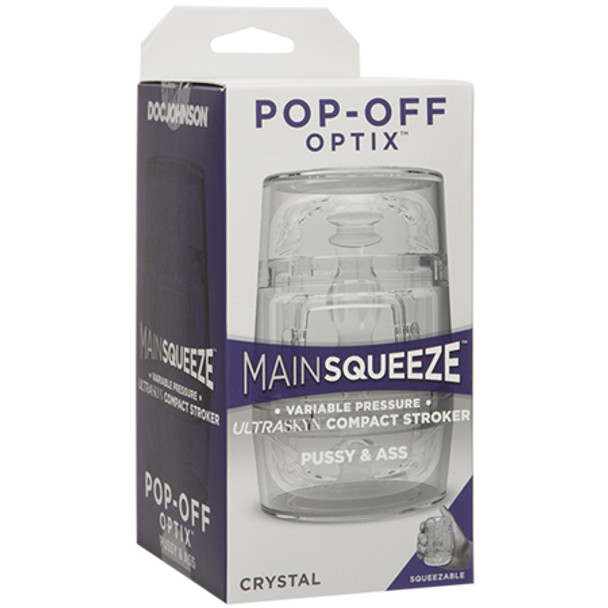 Stroker with hard outer case has both ass and pussy openings. A mini squeeze plate allows user to control pressure. Made from trasparent Ultraskyn. Measures 4 in. long by 2.5 in. wide.