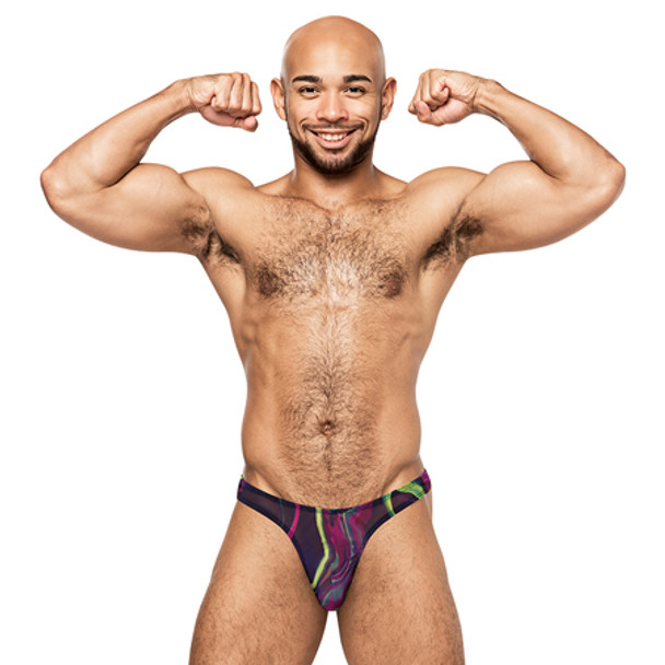 From the Galactic collection by Male Power, the Bong Thong features a slim elongated pouch, a low cut waist and a classic 1 inch thong back.Smooth sheer micro mesh fabric with all way stretch, cosmic themed multi color print throughout.Materials: 90% Nylon 10% Spandex