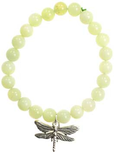 A simple but powerful power bracelet made from natural cut and polished beads with a dragonfly charm.One size fits most thanks to a durable elastic band.Made from natural beads - color, pattern, size and shape will vary between beads.New jade, pewter, elastic.Beads - 1/4" charm - 3/4" bracelet unstretched - 2 1/2"
