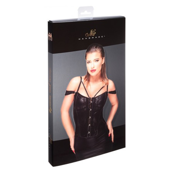 Lace corset with stunning design is sure to get you noticed. The front closes on hooks and the back is made of powerwetlook. Both straps are detachable. Adjustable lacing in the back for a perfect fit.Size L: bust 94-97 cm, waist 73-76 cm, hips 100-103 cm