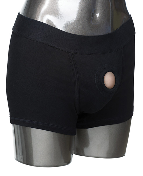 Offering superior support and comfort, the Packer Gear Black Boxer Harness is designed for the ultimate instyle and comfort when fashioning your favorite packer orstimulator. The masculine cut brief has a fashionable classic boxer style, with internal pockets to store your favorite vibrating stimulator. Insert a packer, probe or dong, into the reinforced panel O-ring, and get ready to enjoy sensualand mind-blowing one-on-one action. The Packer Gear Black Boxer Harness is made from washable soft, stretchy cotton/spandex and has an extra wide waistband for additional comfort and support. The boxer's soft lining features discreet internal pockets and an internal strap to secure your preferred packersecurely in place. The reinforced 2-panel design also has a super stretchy O-ring that easily accommodates most standard sizes of erotic and exotic probes. The boxer harness delivers hands-free satisfaction every time. Ideal for first time and experienced users, the Packer Gear Black Boxer Harness requires no external strap adjustments. The boxer shorts slip on like underwear for an ultimate comfort fit. Washable 95% cotton, 5% spandex.