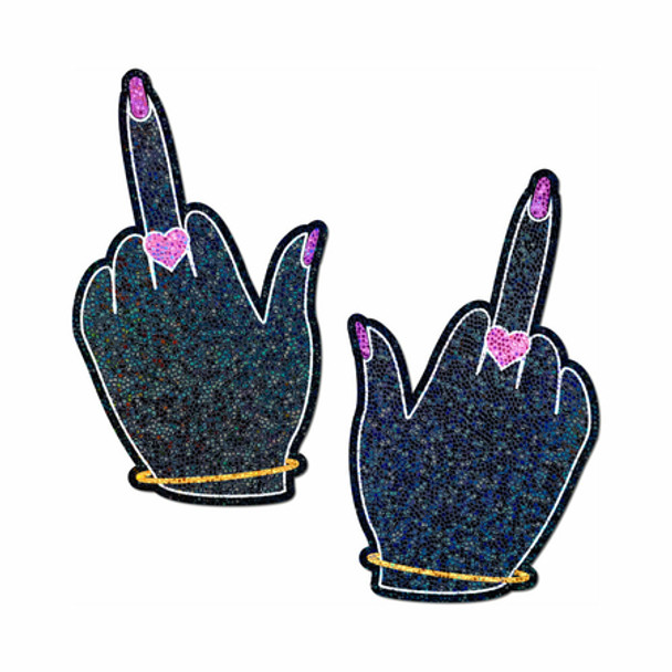 Middle Finger Pasties: Glittering F*ck You Lady Hands Nipple Covers by Pastease® are hand-made in the USA of soft form-fitting material that forms seamlessly to curves and resists wrinkling over hardening nipples.Just peel-and-stick on clean, dry skin. All Pastease® feature latex-free, medical-grade, waterproof adhesive that stay securely in place for as long as you like and until they are gently removed.Conceal or Reveal with Pastease® nipple pasties when worn with a sexy outfit, daring bikini, sheer top, revealing dress, Hefty bag, body lotion, crazy costume, party theme or nothing at all!Dimensions: 2.8 X 4.7 inchesCoverage Diameter: 2 inchesPastease® are the Funmaker that brings out your inner Tease!All Pastease® products are hand-made, so the finished product you receive may vary slightly from the posted image. Go get your Sexy Fun Freedom On! X♥X♥ Pastease®!