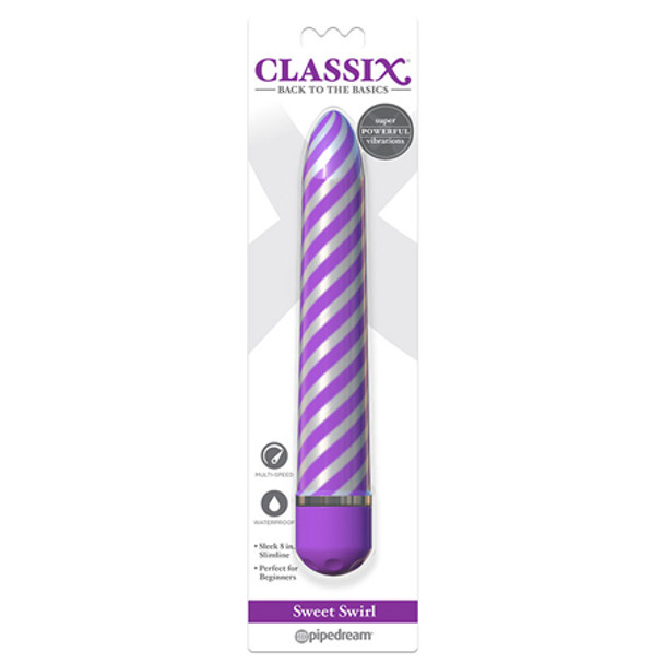 Take a joy ride on this candy stick tonight, Classix Sweet Swirl Personal Massager by Pipedream. Designed for sextoy beginners, for whenever you`re in the mood, Sweet swirl features a tempting, tapered, multispeed vibrations and a yummy shaft to slip and slide on. Classix Sweet Swirl sextoy rod channels vibrations beautifully throughout the firm material, and you`re in charge of the intensity of your session with a simple push-button located at the vibrator`s base. Super powerful vibrations, a pinpoint tip and smooth, delicious shaft are all yours with this Classix vibe by Pipedream. And Sweet Swirl Massager is 100% waterproof and ready to make a splash in every aquatic scene - go wherever your pleasure adventure takes you. Pipedream sensual novelty vibrator for beginners is made with soothing, satisfying ABS material and is nonporous, hypoallergenic, phthalate-free and body-safe for your peace of mind. Lubricate well with your favorite water-based lube, and clean up in a snap before and after use with antibacterial soap or toy cleaner and a warm water rinse. Back to Basics streamlined sex vibrator for women measures 8 inch long (20 cm), 1.25inch diameter and uses 2 C batteries to power up (sold separately).Available in Pink Blue & Purple colors. @npc2019_11