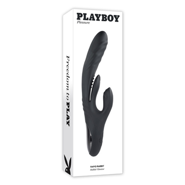 Rapid Rabbit offers a trio of delights designed to bring you endless pleasure effortlessly. Explore the 3 thrusting speeds of the perfectly curved shaft, the 10 uniquely stimulating speeds of the flapper shaft, and the 7 powerful clitoral sensations in the external stimulator. Made of velvet-smooth silicone, discover new pleasures with this unique Rabbit Vibrator.Unique 3-tiered thrusting, flapping Vibrator10 flapping speeds & rhythms3 thrusting speeds & rhythms7 vibrating speeds & rhythmsBody-safe SiliconePhthalate & latex freeWaterproof & submersibleRechargeable, USB cable included5 year WarrantyDimensions: Height: 10.38", Depth: 2.72", Width: 1.67"